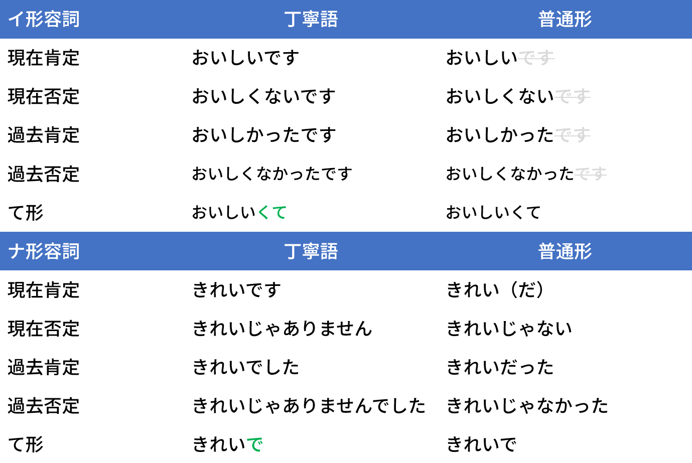 筆記日語關於形容詞的初級內容,包含い形容詞與な形容詞的時態與變化說明。
